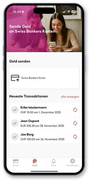 Mit Send können Sie ganz einfach Geld von einer Swiss Bankers Karte auf eine andere Swiss Bankers Karte übertragen - schnell, sicher und bequem. Ob für Familie, Freunde oder Bekannte: Geld senden war noch nie so einfach. Und das in den Währungen CHF, EUR und USD.
